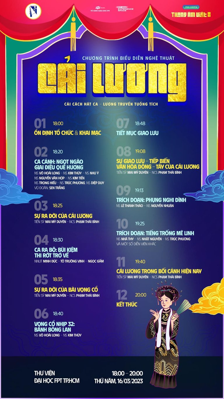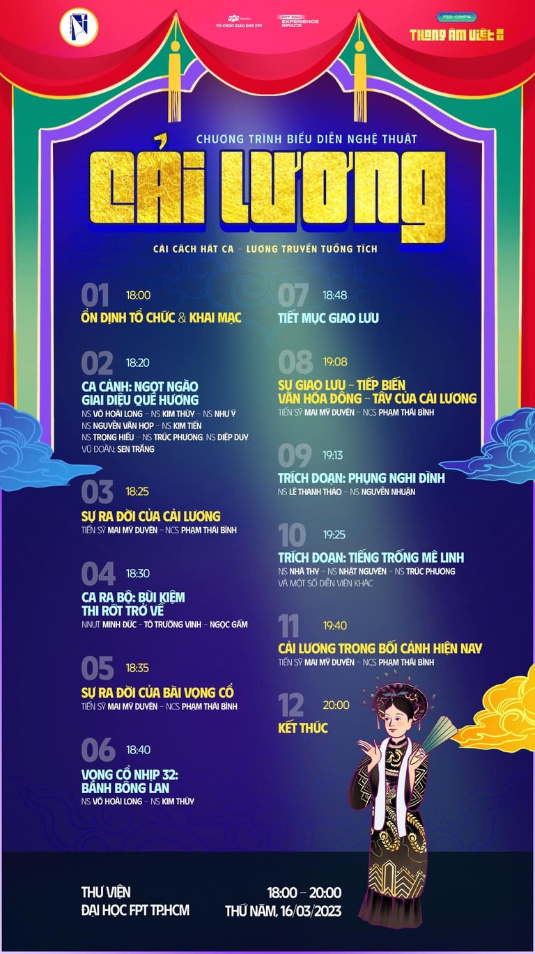 Tiếp nối chuỗi hoạt động trải nghiệm của FES-CAMP 4 “THANG ÂM VIỆT”, chương trình biểu diễn Cải lương "Cải cách hát ca - Lương truyền tuồng tích" và Khai giảng lớp học Cải lương chính thức được triển khai, phối hợp với Nhà hát Cải lương Trần Hữu Trang cùng nhiều nghệ sỹ chuyên nghiệp.