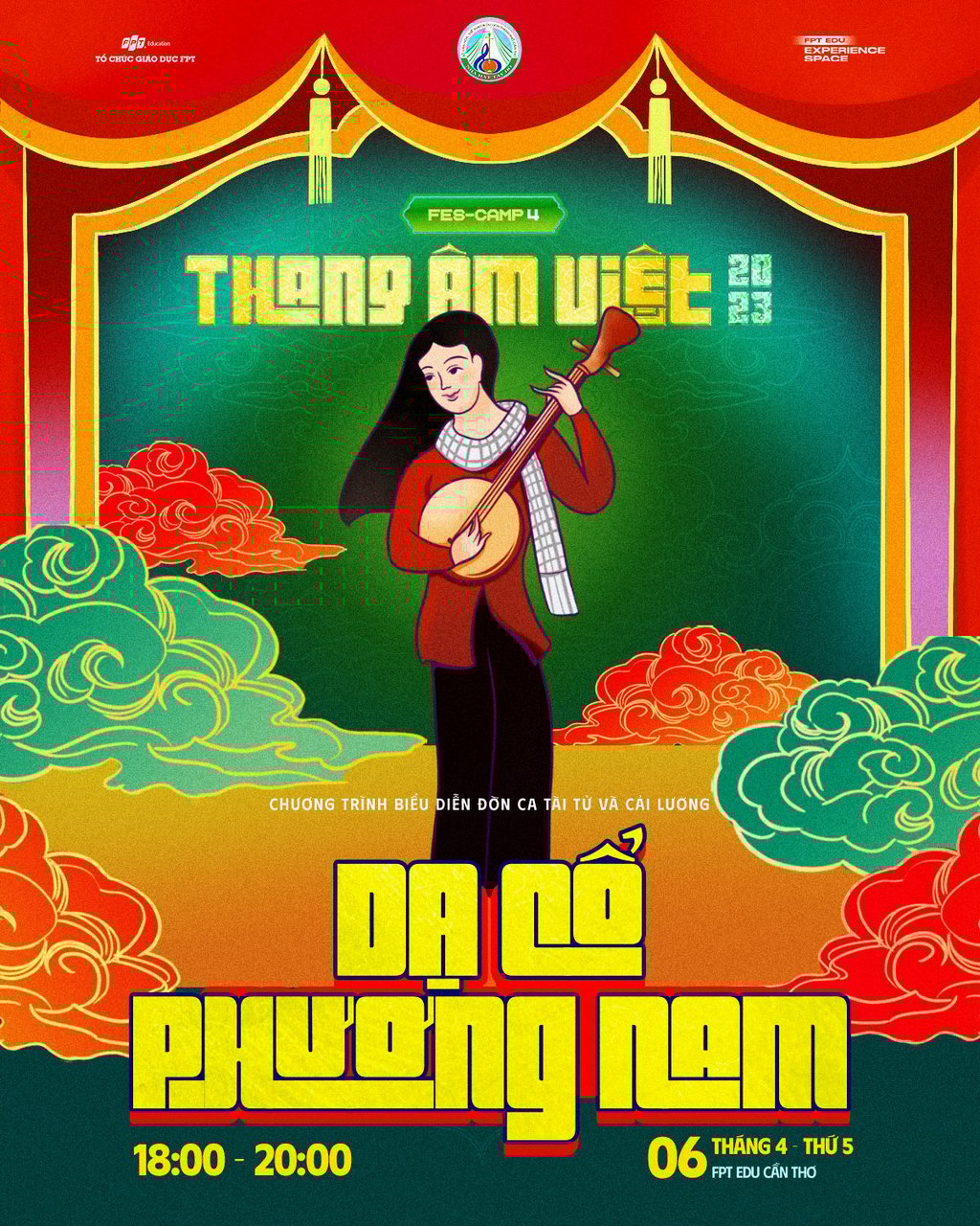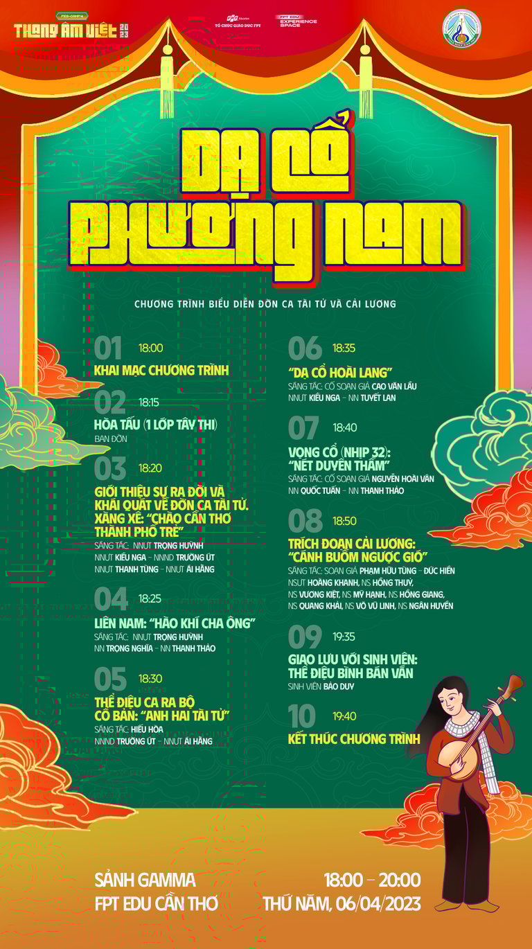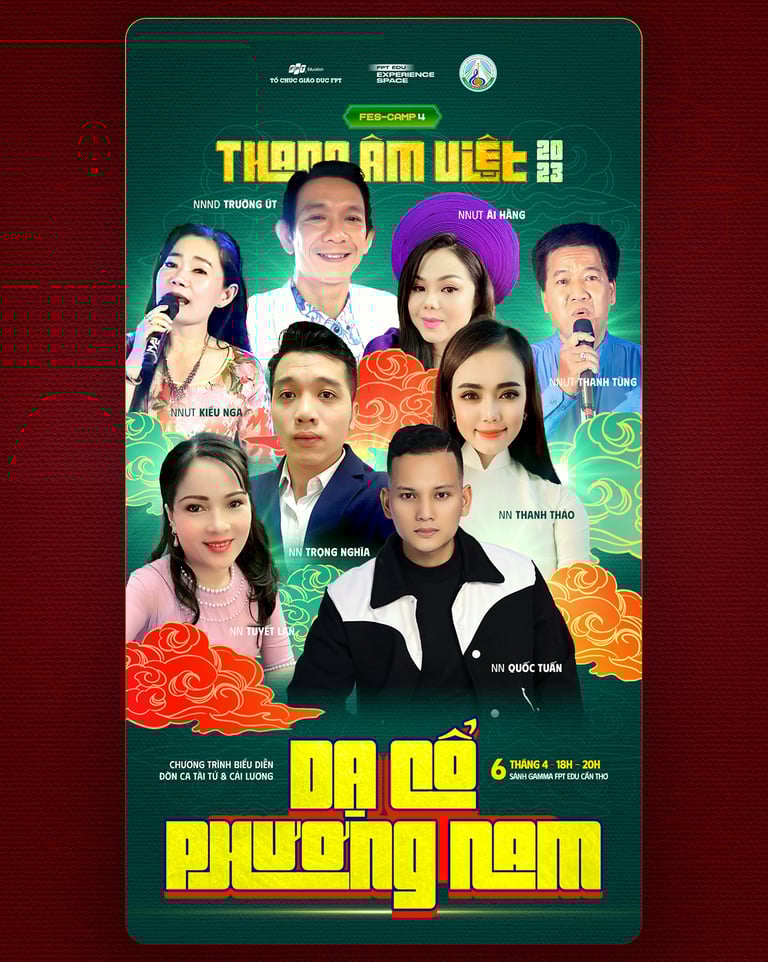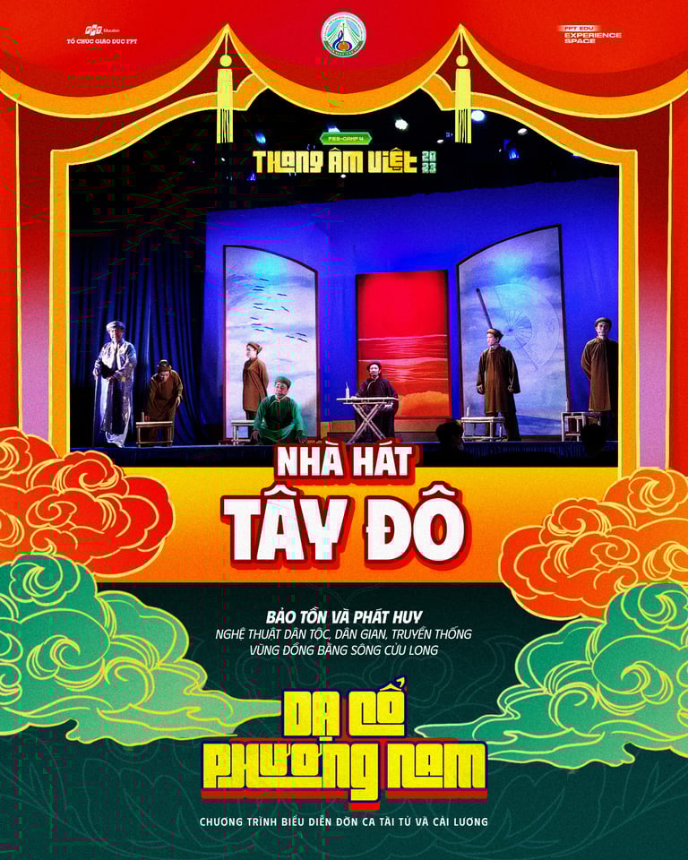 Với sứ mệnh Lan tỏa di sản âm nhạc - Tiếp nối thế hệ tương lai, Chương trình biểu diễn Đờn ca tài tử và Cải lương "Dạ Cổ Phương Nam" với sự đồng hành của Nhà hát Tây Đô tại FES-CAMP 4 "THANG ÂM VIỆT" sẽ giúp các bạn trẻ là học sinh, sinh viên, CBGV Tổ chức Giáo dục FPT trải nghiệm và hiểu rõ hơn về đời sống xã hội Việt Nam qua những tiết mục đặc sắc.