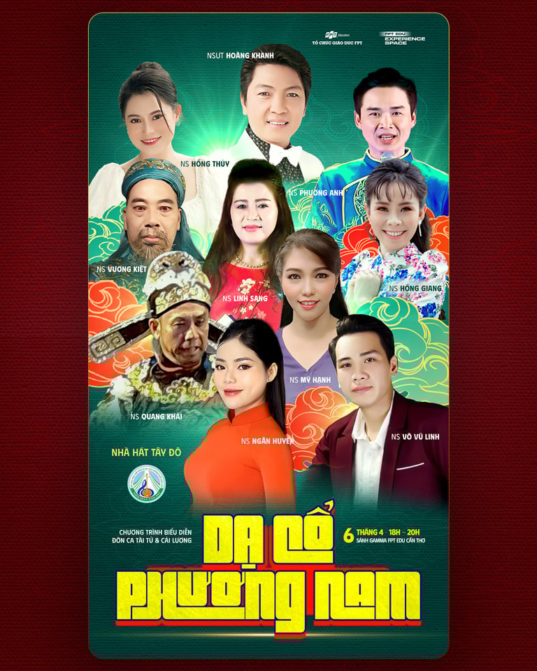 Tại Chương trình biểu diễn Đờn ca tài tử và Cải lương “Dạ cổ Phương Nam”, các nghệ sĩ ưu tú, nghệ sĩ nhân dân, nghệ nhân Nhà hát Tây Đô sẽ mang đến nhiều tiết mục đặc sắc. Đây là cơ hội để các bạn học sinh, sinh viên, CBGV Tổ chức Giáo dục FPT thưởng thức và trải nghiệm nghệ thuật truyền thống vùng Đồng bằng sông Cửu Long.