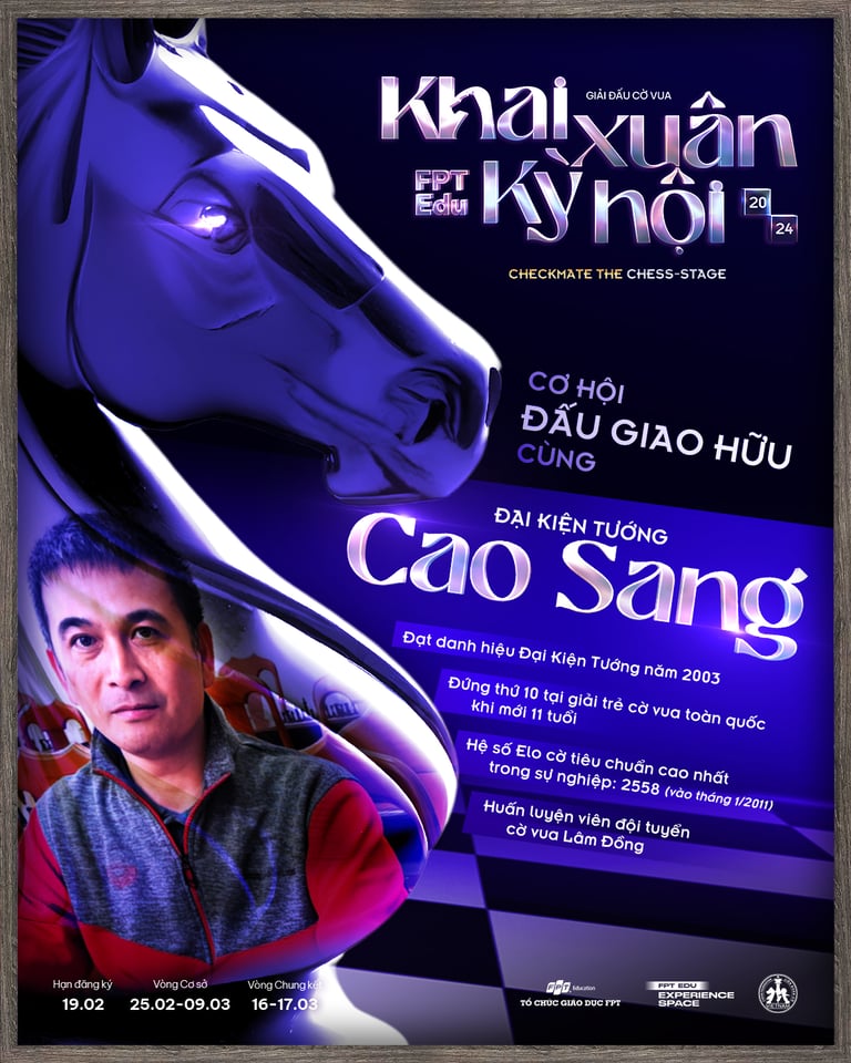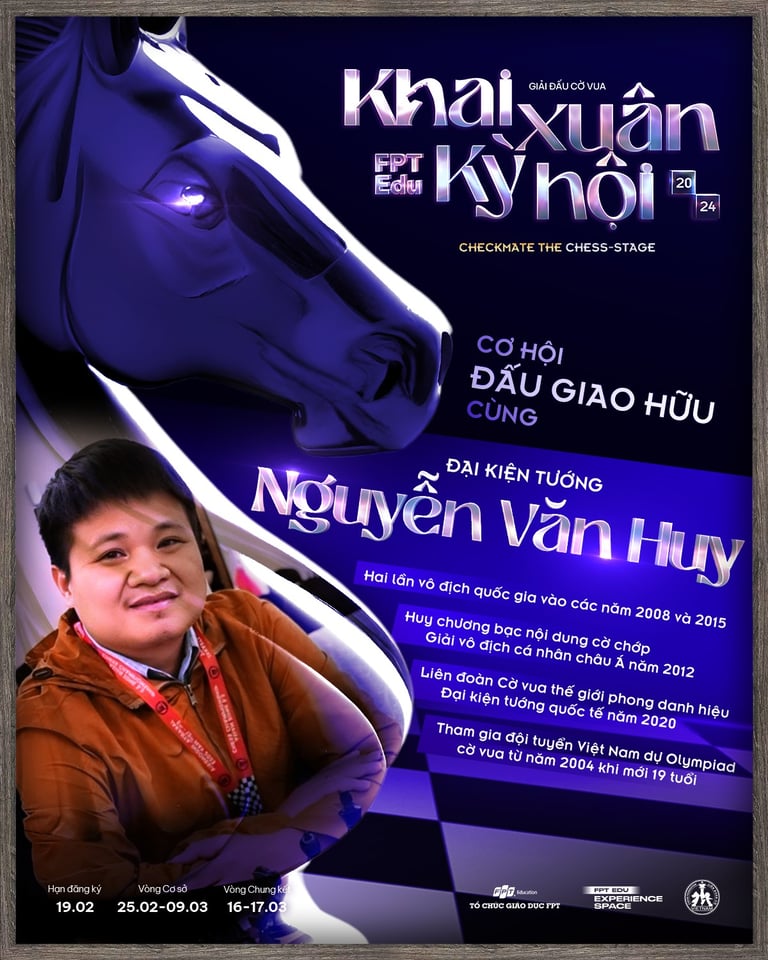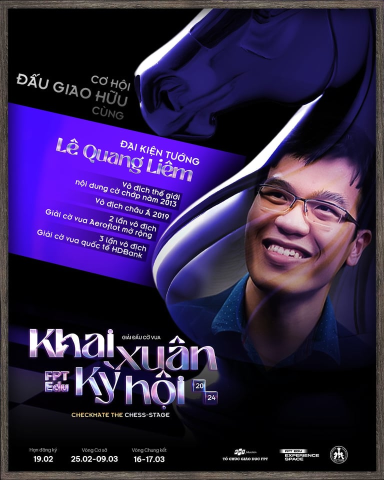 Giải đấu cờ vua FPT Edu Khai Xuân Kỳ Hội 2024 với chủ đề "Checkmate the Chess-stage" là sân chơi trí tuệ lý thú và bổ ích dành cho học sinh, sinh viên của Tổ chức Giáo dục FPT trên toàn quốc. Tại đây, các bạn trẻ sẽ được khuyến khích tinh thần học hỏi, thi đấu trong môi trường công bằng và trung thực. Đặc biệt, giải đấu còn mở ra cơ hội giúp thí sinh được giao lưu và tích lũy kinh nghiệm quý giá cùng các Đại kiện tướng của Việt Nam.