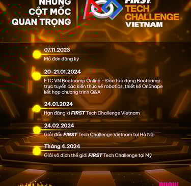 FIRST TECH CHALLENGE Việt Nam 2023-2024 đang khuấy động cộng đồng fan Công nghệ Việt Nam. Vậy nên, đừng quên lưu lại những điểm thời gian quan trọng để không bỏ lỡ những khoảnh khắc quan trọng của FIRST Tech Challenge Vietnam nhé!